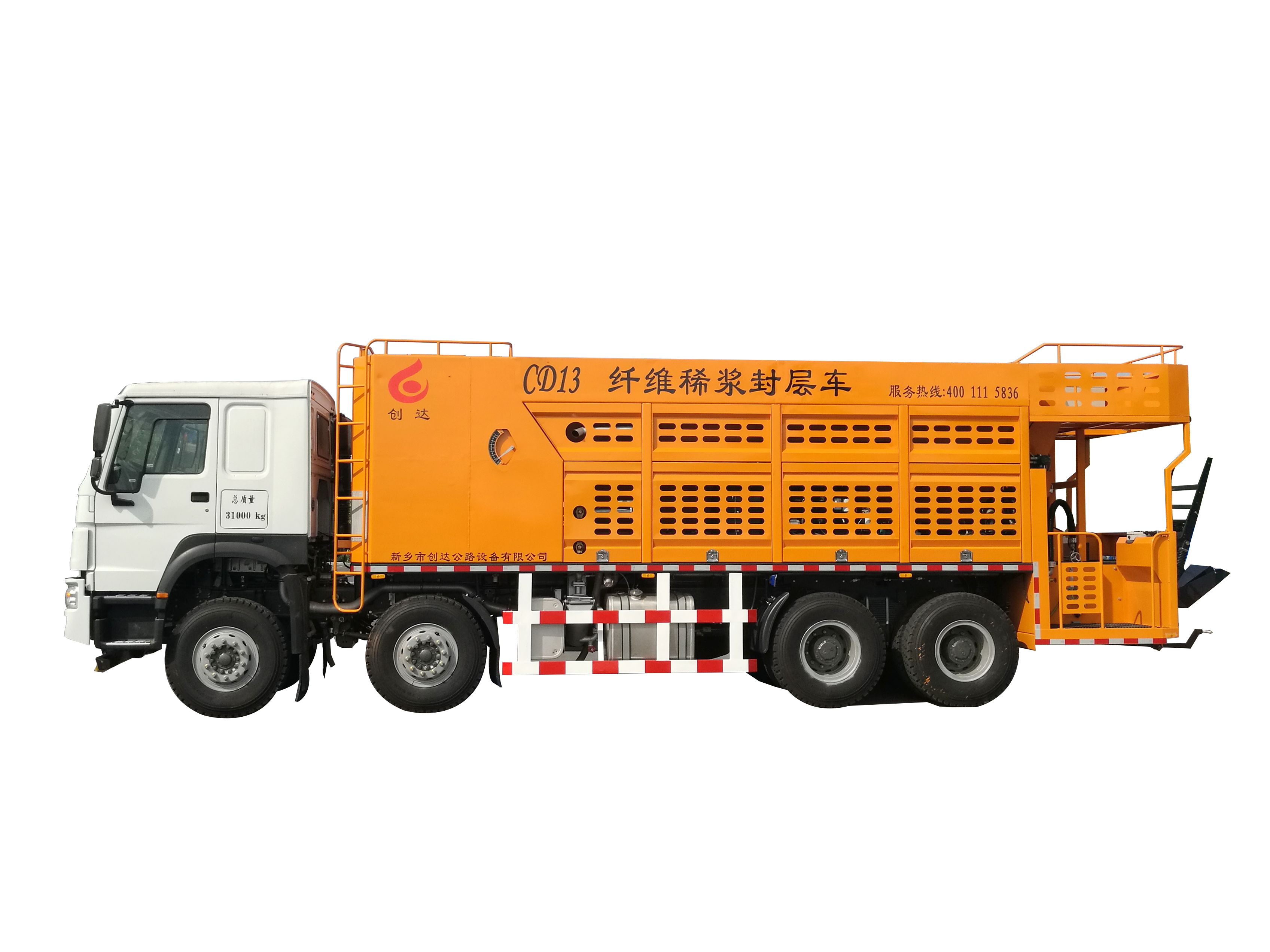 我公司設計生產的CDXF13AX型纖維稀漿封層車采用機、電、液、氣一體化操作控制,具有物料按比例摻配精準、纖維切割分散均勻一致、混合料拌和強勁、漿料布料均勻無離析、攤鋪平整一致、低速控制穩定等優點,是目前纖維稀漿封層與微表處施工的理想機械。